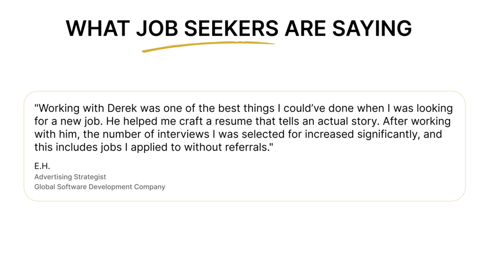 "Working with Derek was one of the best things I could’ve done when I was looking for a new job. He helped me craft a resume that tells an actual story. After working with him, the number of interviews I was selected for increased significantly, and this includes jobs I applied to without referrals." -E.H.