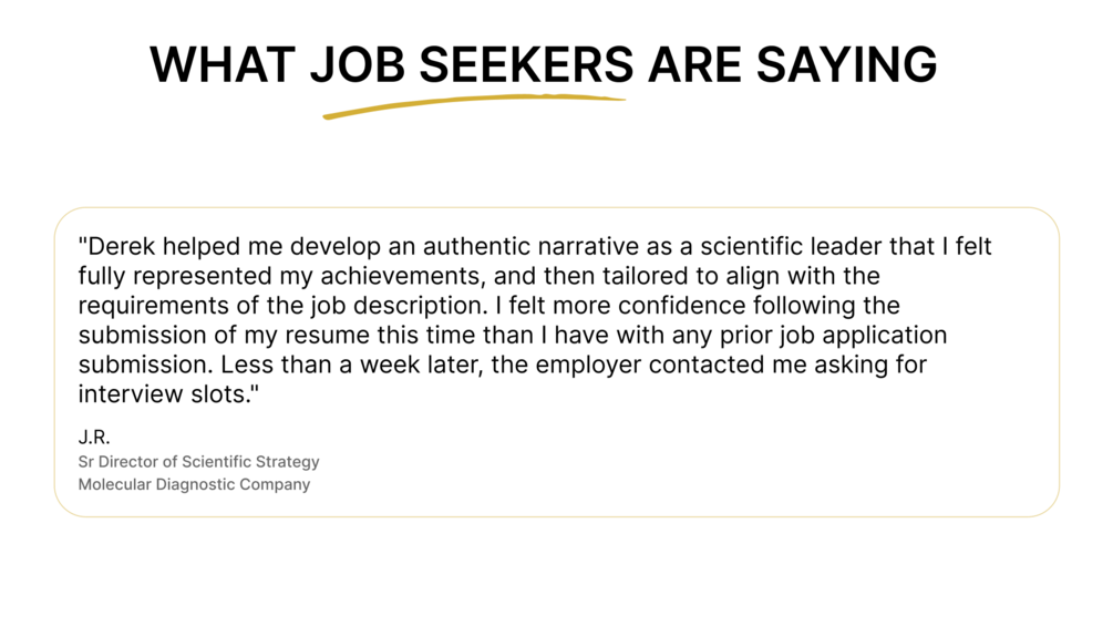 "Derek helped me develop an authentic narrative as a scientific leader that I felt fully represented my achievements, and then tailored to align with the requirements of the job description. I felt more confidence following the submission of my resume this time than I have with any prior job application submission. Less than a week later, the employer contacted me asking for interview slots." -J.R.