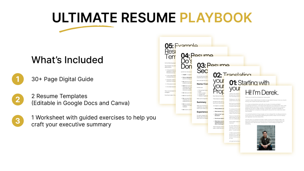 You'll get a 30+ Page Digital Guide, 2 Resume Templates (examples and editable versions in Google Docs and Canva) , and 1 Worksheet with guided exercises to help you craft your executive summary.